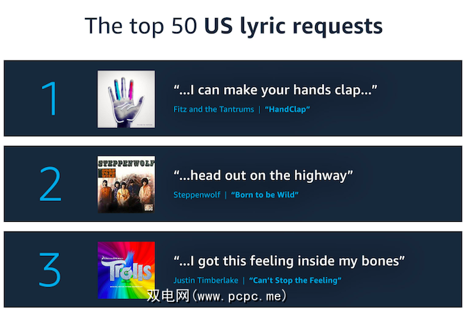 Amazon最近还通过Alexa发布了歌词要求最高的前50首歌曲的列表。 Fitz和Tantrums的第一首《 HandClap》。名单上出现的其他歌手包括贾斯汀·汀布莱克(Justin Timberlake),《旅程》,埃德·希兰(Ed Sheeran)和皇后乐队(Queen)。