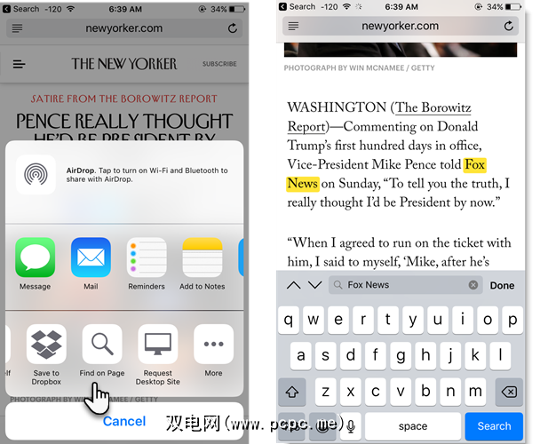 打开任何网页。点击屏幕底部的共享(带有向上箭头的正方形)图标。滑动出现的一系列图标。您将看到一个放大镜图标,代表在页面上查找功能。