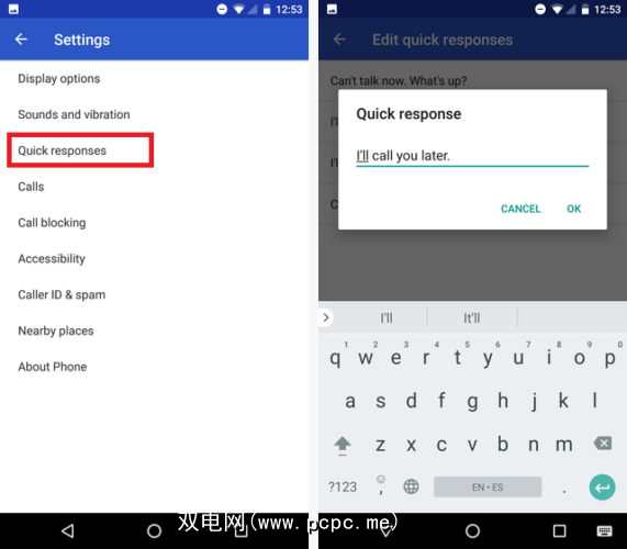电话响起时,请点击屏幕左下角的消息图标。您将获得一个预定的响应列表以供选择,或者甚至可以通过 Dialer App>设置>快速响应来制作自己的响应。