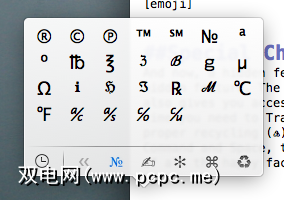 现在,一个隐藏功能隐藏在另一个隐藏功能内。似乎无用的表情符号菜单也使您可以访问特殊字符。因此,下次您需要对Something™做商标或要求适当的回收(?)时,只需按Control,Command和Space,然后单击所有笑脸右侧的图标即可: