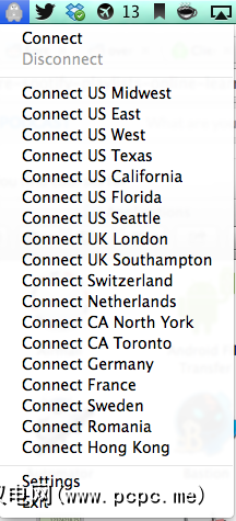 Once installed and correctly configured, it’s time to connect! You’ll notice a new icon in your OS X toolbar. Click it, and select ‘connect’.