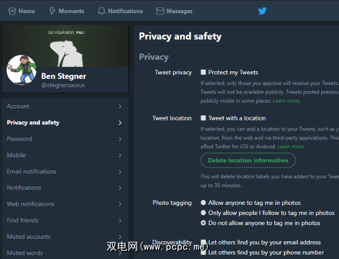 对于Twitter,请访问“设置",然后单击左侧的隐私和安全标签。在这里,您可以保护自己的tweet,使其不公开,从tweet中删除您的位置,禁用照片标记,并防止其他人发现您。