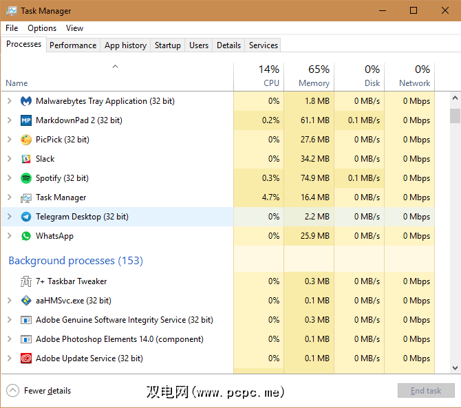 在Windows上,单击“开始"按钮并搜索任务管理器或使用快捷方式 Ctrl + Shift + Esc 打开任务管理器。在进程标签上,您会看到在前台运行的应用程序。在它们下面是后台进程,然后是系统进程。浏览并用Google搜索您发现的任何可疑内容。