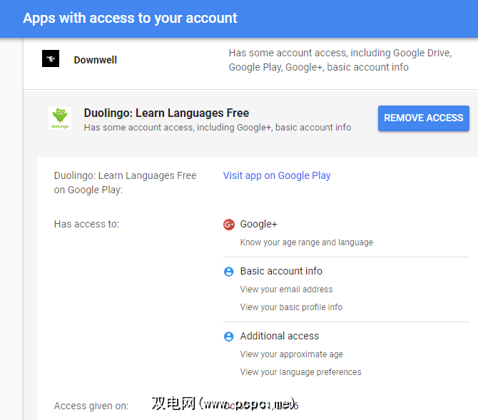 仔细研究这些内容,尤其是当您使用Google帐户已有很长时间时。您应该撤消对不再使用的应用程序的访问权限,并查看当前应用程序具有的访问权限。单击一个条目,然后单击删除访问权限按钮将其扔掉。