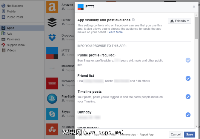 每个应用列表都列出了哪些观众可以看到共享的内容从这些应用程序中。单击一个以获取详细权限,显示该应用可以访问的内容。您可以删除某些权限,也可以单击某个应用程序上的 X 图标将其从您的帐户中删除。