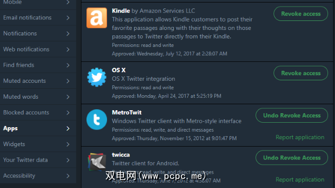 您可能还需要查看已连接到自己的应用程序Twitter帐户。访问Twitter设置的“应用程序"标签以查看所有内容。点击撤消访问权限以删除您不再使用的任何内容。