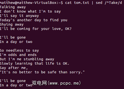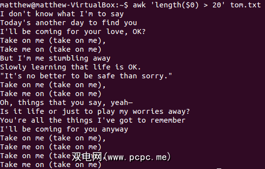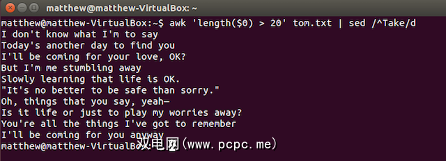 让我们尝试一下:我们将使用Awk列出Take On Me中具有20个以上字符的所有行。然后,我们将剥离所有以“接管" 开头的行。在一起,一切看起来像这样:
