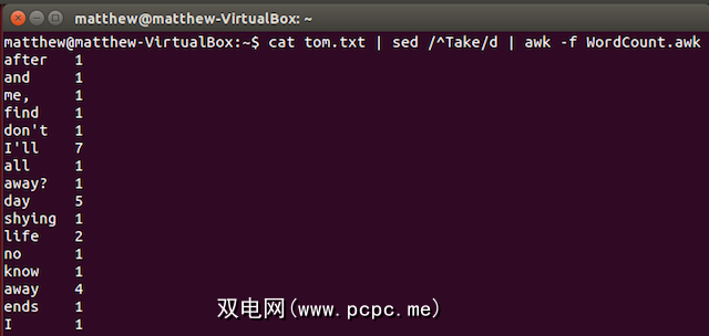 现在,我们将其翻转。我们将首先删除以Take开头的所有行,然后将它们通过管道传输到Awk,在此我们将计算每个单词出现的次数。看起来有点像这样: