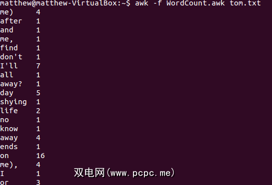 { for (i = 1; i <= NF; i++) freq[$i]++}END { for (word in freq) printf "%s\t%d\n", word, freq[word]}保存它,然后使用以下命令运行它。