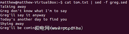 如果需要进行一些更复杂的编辑,还可以将Sed指令合并到文件中。受到这个热闹的Reddit主题的启发,我将歌词添加到A-Ha的 Take On Me 中,并用Greg替换“ I",“ Me"和“ My"的每个实例
