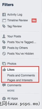 如果您想深入了解自己的喜欢,左侧有一个菜单,您可以仅查看一种类型的互动。在这种情况下,您需要点击喜欢。将会出现一个小的子菜单,您可以在其中进一步浏览帖子和评论或页面和兴趣。