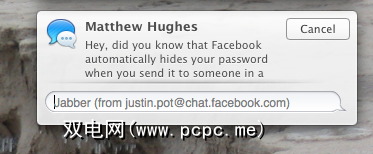 Messenger.app,它取代了iChat Mountain Lion,不包括添加Facebook的两步过程。但是它确实提供了Jabber支持-Facebook也提供了一些支持。添加此内容,您就可以使用Maverick的新通知来响应Facebook消息,而无需打开浏览器窗口: