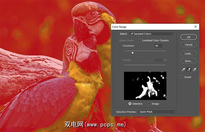 在“颜色范围"对话框中,您可以选择几种方式查看图片。在对话框本身中,已选择将显示黑白极化的缩略图。