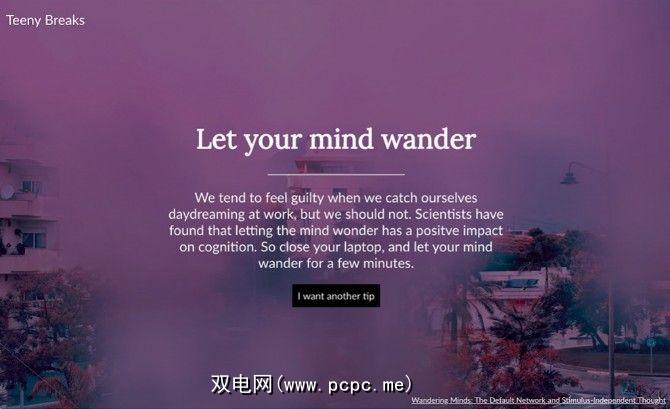 可以作为网站或以生产力为中心的Chrome新标签页扩展程序使用,Teeny Breaks每次访问时都会为您提供新的建议。这些建议是有科学根据的技巧,可以改善您的健康状况,例如进行2分钟的剧烈运动,以改善您的注意力和短期记忆。每个提示都包含引文,因此您可以阅读更多有关其有效性的信息。