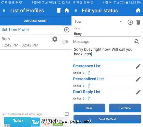 您可以使用自定义消息创建多个配置文件,并可以定制谁会收到自动回复。它可以发给发短信和/或给您打电话的任何人,并且只能发给您的联系人或非您的联系人。您还可以选择一个完全个性化的列表以接收消息(个性化列表)或一个要排除的个性化列表(不回复列表)。紧急列表使您可以将无论如何都会收到其呼叫的某些联系人列入白名单。
