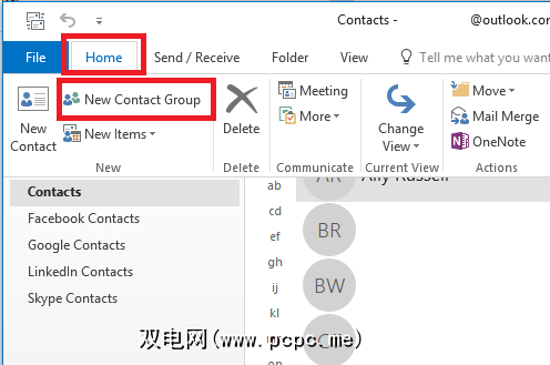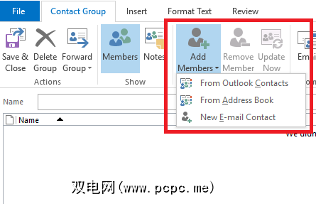 要将其他人加入该组,请单击位于顶部的功能区中的添加联系人。这页纸。您可以选择从Outlook联系人或通讯录中添加人。要添加不在此列表中的任何人,您首先需要为其创建联系人页面。