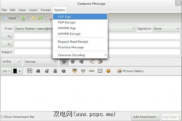 进行设置。撰写新邮件时,可以在“选项"菜单中更改设置为默认值的选项,因此,如果您默认情况下不对电子邮件进行加密(因为您可能没有所有人的密钥,那么您会发送电子邮件) ),您仍然可以为该特定消息启用它。