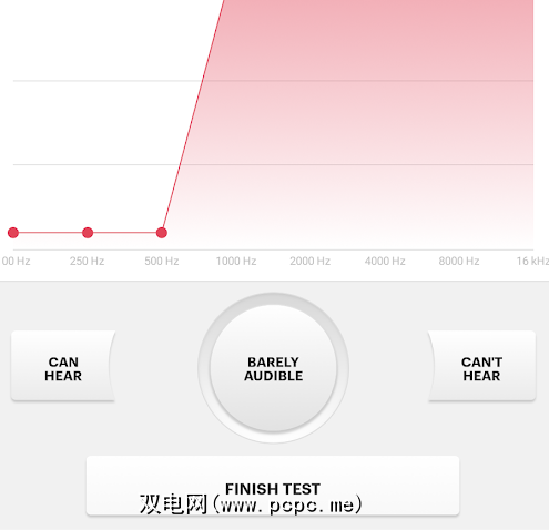 如果听不到任何声音,请按“听不到"按钮,并且蜂鸣声会增加。继续按“听不到"按钮,直到听到哔声为止,然后点按“听见"按钮。继续按“可以听到"按钮,直到听不到声音为止。到达几乎看不到噪音的转折点时,请按Barely Audible。勉强按下,Audible移至新频率。重复该过程,直到测试结束。