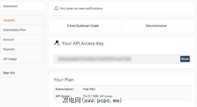 完成注册过程后,您将获得API密钥。从这里,您可以查看快速入门指南或文档。