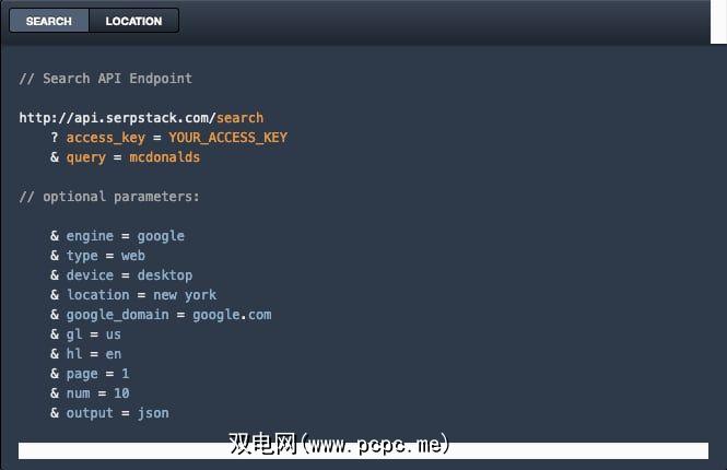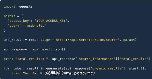 您只需要两条信息就可以开始使用serpstack API。第一个是您刚刚检索的API密钥。第二个是您要搜索的术语。您只需将它们添加到API端点即可,该端点为 https://api.serpstack.com/search 。