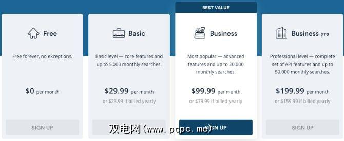 商业计划可为您提供20,000次搜索,每月费用为99.99美元,如果您每年付款,则每月为79.99美元。同时,Business Pro计划每月费用为199.99美元,如果按年支付,则每月为159.99美元,每月可为您提供50,000次搜索。