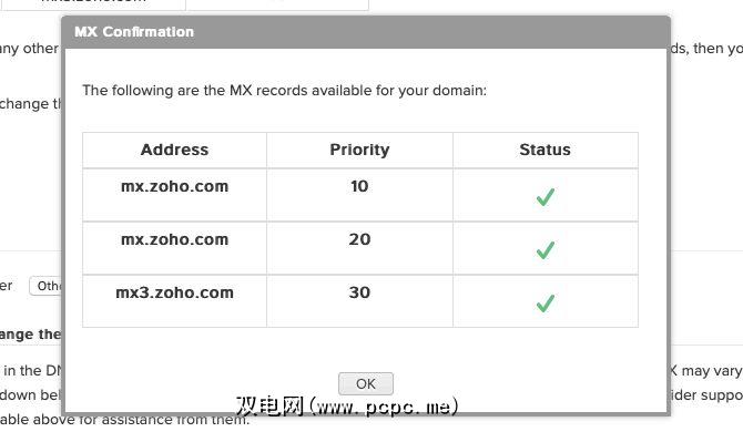 按照说明进行操作并更新MX记录后,返回到控制面板并单击 MX查找 >按钮。在随后出现的确认提示中,单击确定按钮。