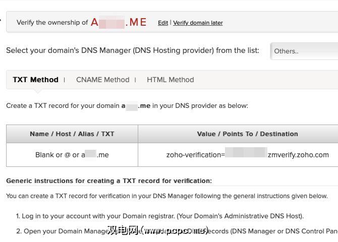 从选择域的DNS管理器中选择DNS托管提供商后,您会收到Zoho对每种方法的说明。从列表中下拉菜单。使用此在线教程来识别您的域的DNS主机。