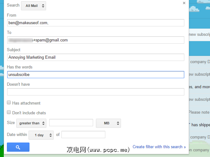要开始创建Gmail过滤器,请打开收件箱,然后单击右侧的小箭头图标。搜索栏的一侧。这会打开高级搜索框,您可以在其中指定要查找的电子邮件的多个属性。您会注意到在该窗口的右下角,有一个链接,显示使用此搜索创建过滤器。我们只需要指定条件,然后我们就可以使用过滤器!