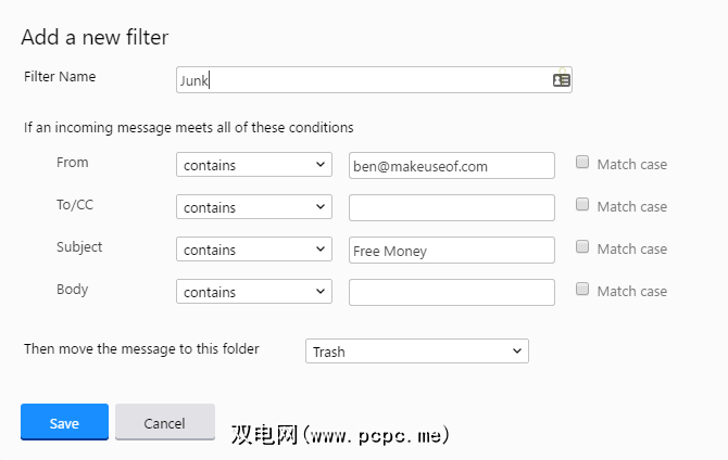 类别就像在Gmail中一样,但是对于每个类别,您可以选择过滤包含,不包含,开头,或以结尾的所选单词。您还可以匹配大小写,如果您要过滤全部大写的首字母缩写词,这会很方便。根据需要完成过滤器后,您可以选择将匹配邮件移至哪个文件夹。