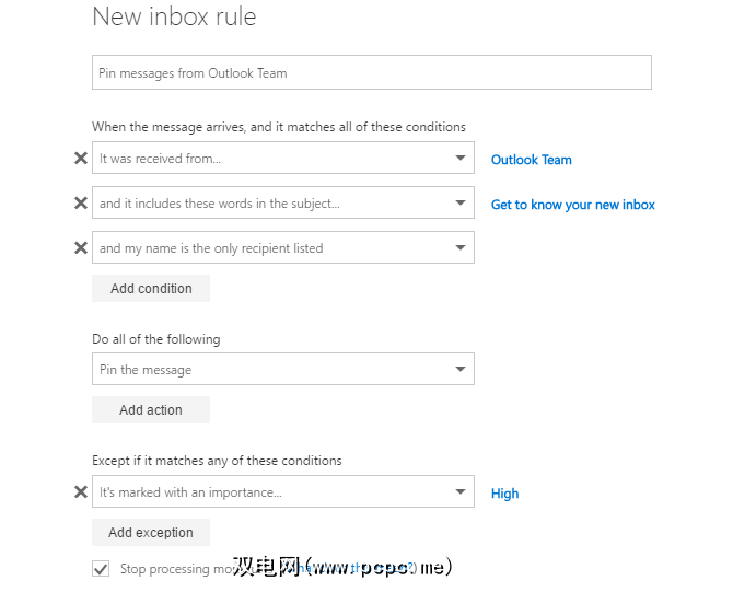 最后,Outlook允许您使用任何较早的条件添加例外。因此,您可以设置整个过滤器,但不包括来自一个人的邮件或标记为重要的邮件。