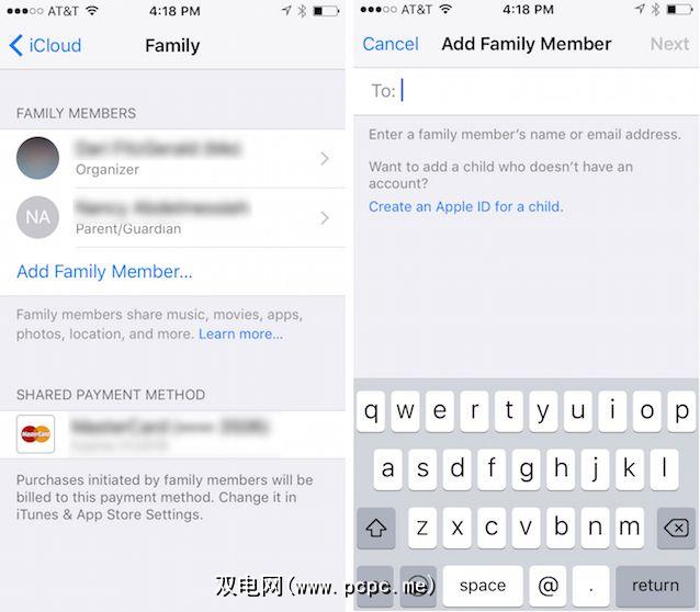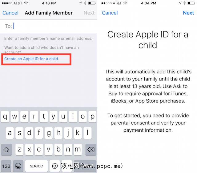 要设置子帐户,转到设置> iCloud>家庭>添加家庭成员…,然后输入为孩子创建Apple ID ,而不是输入电子邮件地址。
