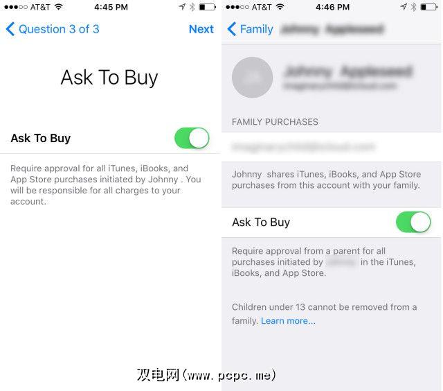 未满年龄的孩子不能从“家庭共享"列表中删除13个,但可以打开和关闭“要购买"功能。
