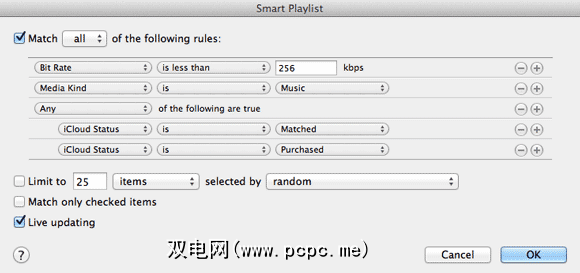 这并不像应该的那么容易,但是基本上您需要从iTunes删除匹配的歌曲,然后从云中下载它们。问题在于确定哪些歌曲可以升级。要轻松做到这一点,请使用以下选项创建一个新的智能播放列表: