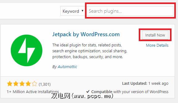 由于它是一个受欢迎的插件,因此您应该会在页面顶部看到Jetpack。如果没有,请使用右上角的搜索框找到它。