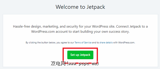 点击设置Jetpack >,您将被自动重定向到WordPress.com。您可以使用现有帐户登录,也可以创建一个新帐户。无论哪种方式,都请按照屏幕上的提示同意连接。