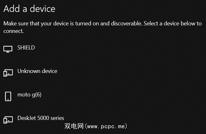 (注意:您也可以右键点击任务栏中的“蓝牙"图标,然后从上下文菜单中选择添加蓝牙设备。使用设置菜单时,您会看到与添加设备相同的屏幕