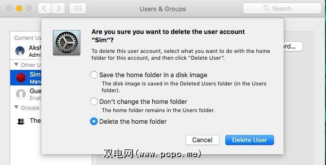 现在是时候确定要执行的操作了使用您要删除的帐户的主文件夹-将其另存为磁盘映像,完整保留或删除。在弹出的框中选择以下选项之一,然后点击删除用户按钮。您可能仍会在共享文件夹和Time Machine备份中找到与已删除的用户帐户有关的残留文件。尽可能全部获取。