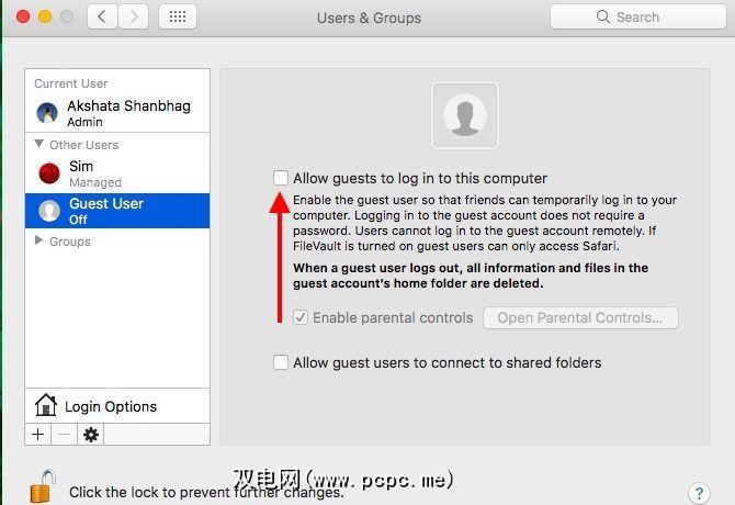您也可以通过为来宾用户设置家长控制来锁定部分macOS。启用访客用户访问权限时,选中启用家长控制复选框。然后从系统偏好设置>家长控制中指定要设置的限制。您可以随时执行此操作。