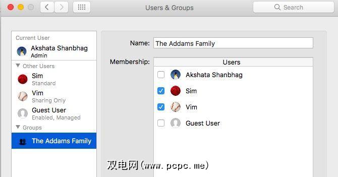 一旦从系统偏好设置中创建了一个组>用户和组,它将显示在用户帐户列表下方。选择组,然后在右侧面板中,选择要添加到该组的每个用户的复选框。