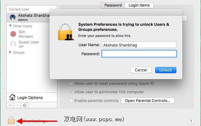 您将在用户和系统偏好设置的“组" 部分。要启用这些选项,请点击对话框底部的“锁定"图标,输入系统密码,然后点击 Unlock 按钮。
