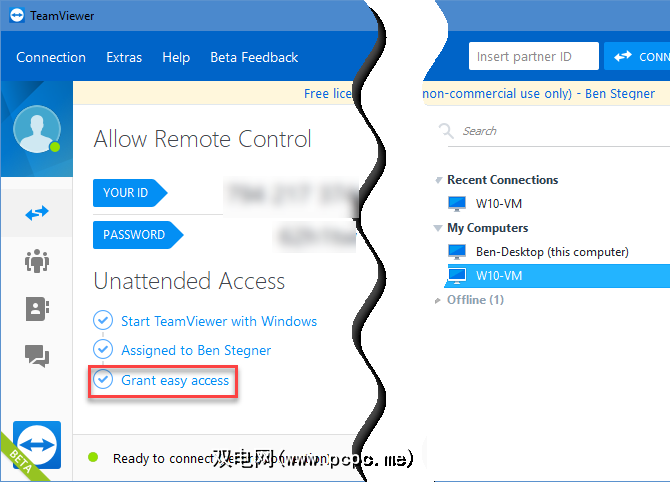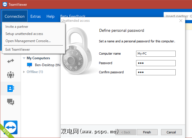 要进行设置,请下载并安装TeamViewer(如果尚未安装)。安装完成后,点击连接标签,然后选择设置无人参与访问。给您的PC取一个名字,以便在向TeamViewer添加更多计算机时可以识别它。然后添加密码以保护远程连接。