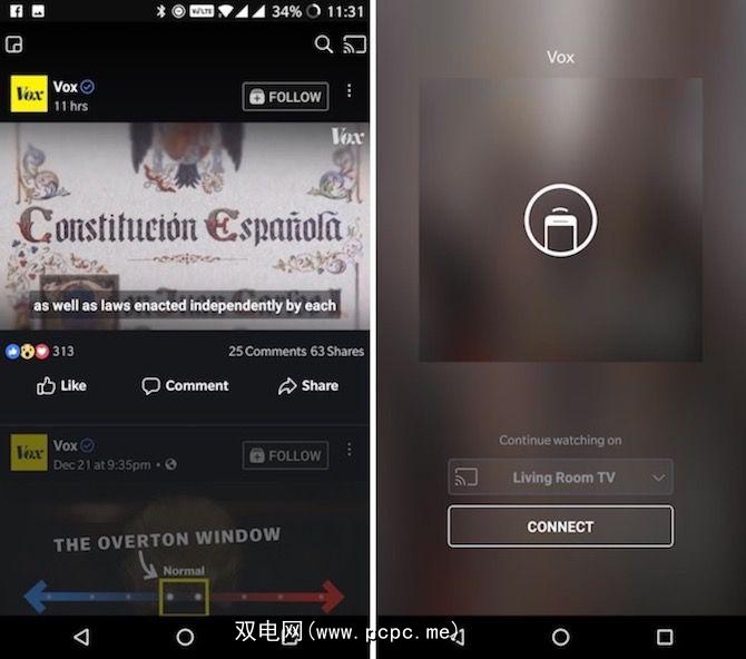在电视上观看Facebook视频。观看视频时,您会在右上方找到熟悉的“投射"按钮。点击``投射''按钮,选择您的Chromecast,就可以了。