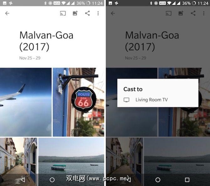 打开Google相册应用时,您会发现每个部分顶部(搜索栏旁边)的投放图标。连接到Chromecast后,您只需在智能手机上查看照片/视频即可。您在手机上查看的所有内容都会显示在电视上。