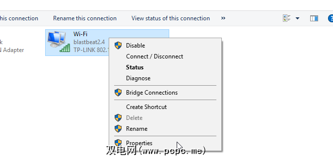 从此处,右键单击您的Wi-Fi连接(如果您以无线方式连接到Internet;否则,请选择连接到调制解调器的电缆),然后选择属性。