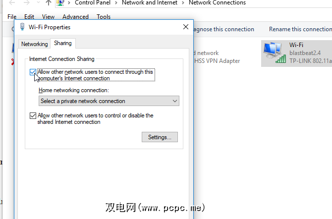 在共享标签中,请检查允许其他网络用户通过此计算机的Internet连接进行连接。