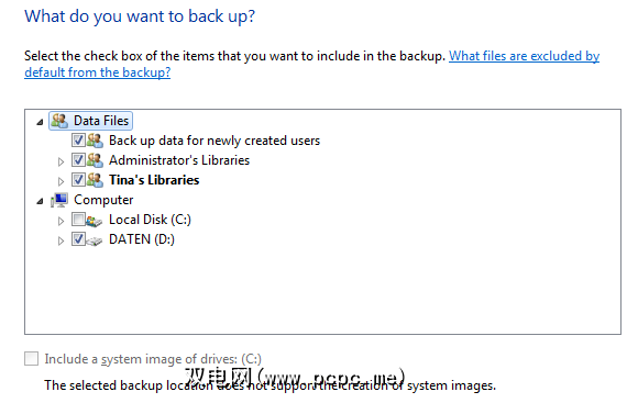 在上一个窗口中单击> Next 之后,您可以检查驱动器,分区和文件夹您想要备份。请注意,即使您在备份中包括系统驱动器,“备份和还原"也不会备份程序文件或系统文件。但是,如果备份目标上有足够的可用空间,则可以>在备份中包含系统映像。