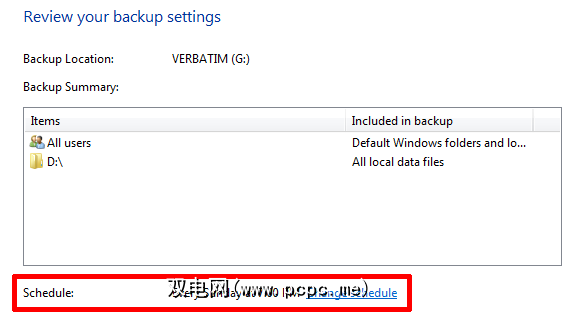 只需提一下,如果选择了第一个备份选项,即>让Windows选择,您将直接进入上面的屏幕,您可以查看备份设置并管理备份计划。创建系统映像将不是一种选择。