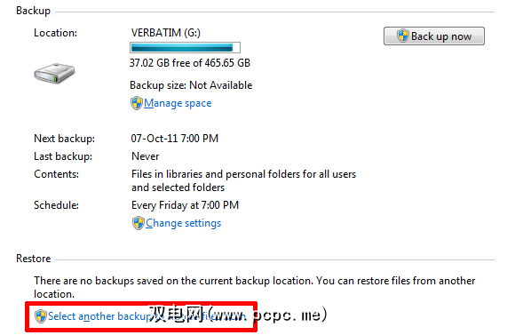 “备份和还原"窗口现在将列出您的备份,您可以在此处更改备份设置,例如,更改要备份的内容或调整计划。在窗口底部,有一小部分称为>还原。要还原备份,请单击>选择另一个备份以从中还原文件,然后浏览要还原的先前备份。