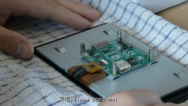 在将Pi连接到触摸屏显示器之前,请格外注意。您应该将显示器放在盒子里,但要面朝下,使触摸屏放在泡沫包装上,或者将面朝下放在桌上的毛巾上。