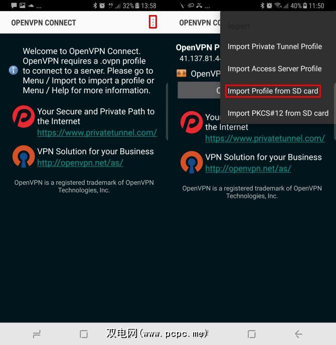 前往OpenVPN Connect应用程式。从OpenVPN Connect选项菜单中,选择导入>从SD卡导入配置文件。